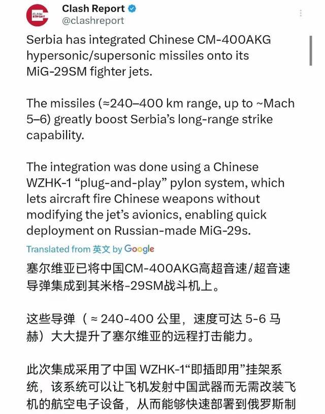 塞尔维亚一架俄制米格-29SM+战机起飞时,机翼下居然挂着咱们中国造的CM-400AKG导弹,这混搭组合直接把欧洲各国看傻了,全网都在热议这波操作到底有多硬核。
